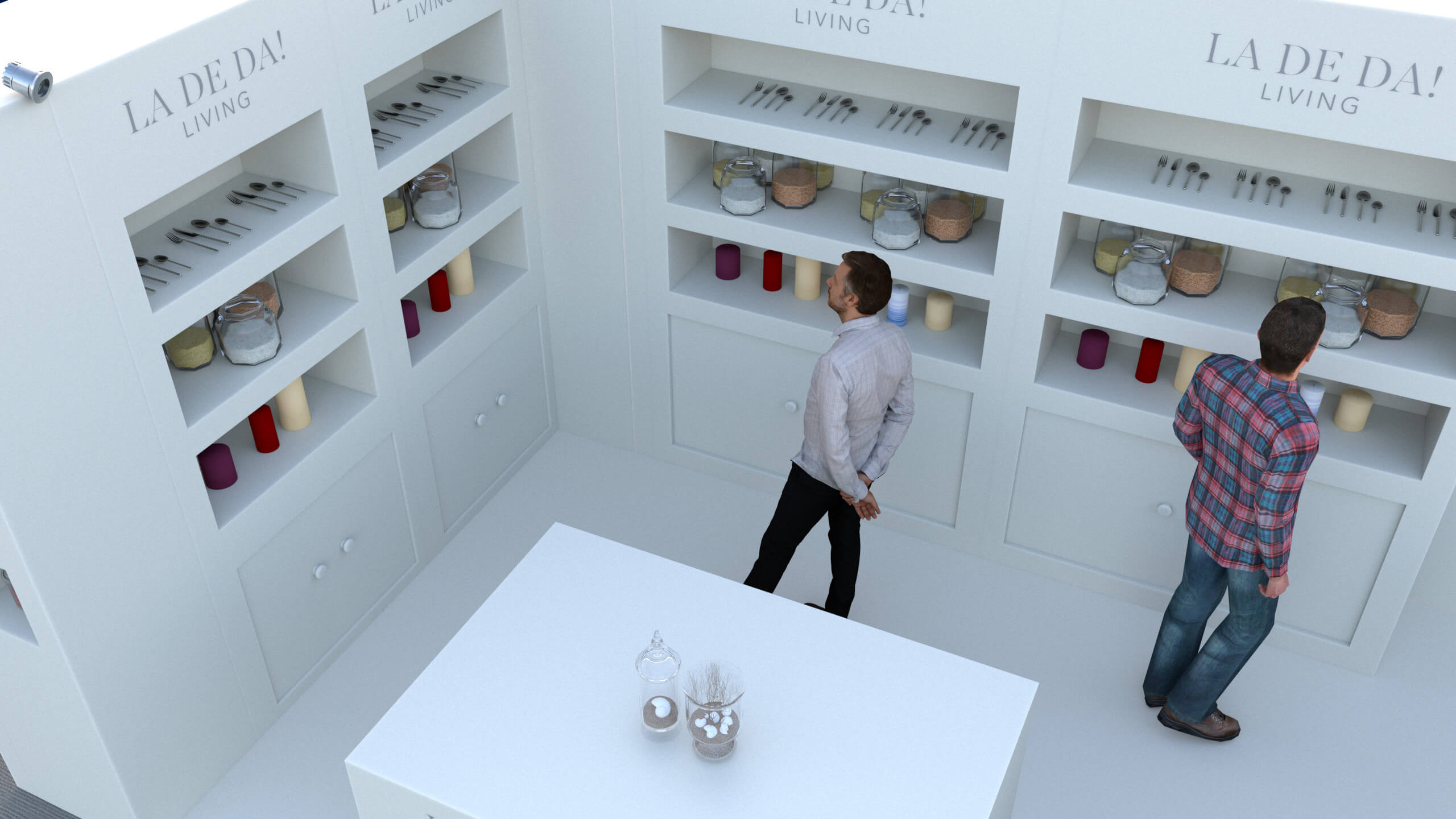 La De Da Living required a similar process, though the scale was smaller and more focused on product presentation. As a personalised homeware and gift brand, their stand needed clarity, warmth, and a sense of premium craft. The 3D model allowed us to test shelving, backdrops, and layout options before settling on the most effective design. The final visualisation helped secure approval and supported the installation at the Good Morning event, where the stand went on to be listed among the Top 10 at the show.