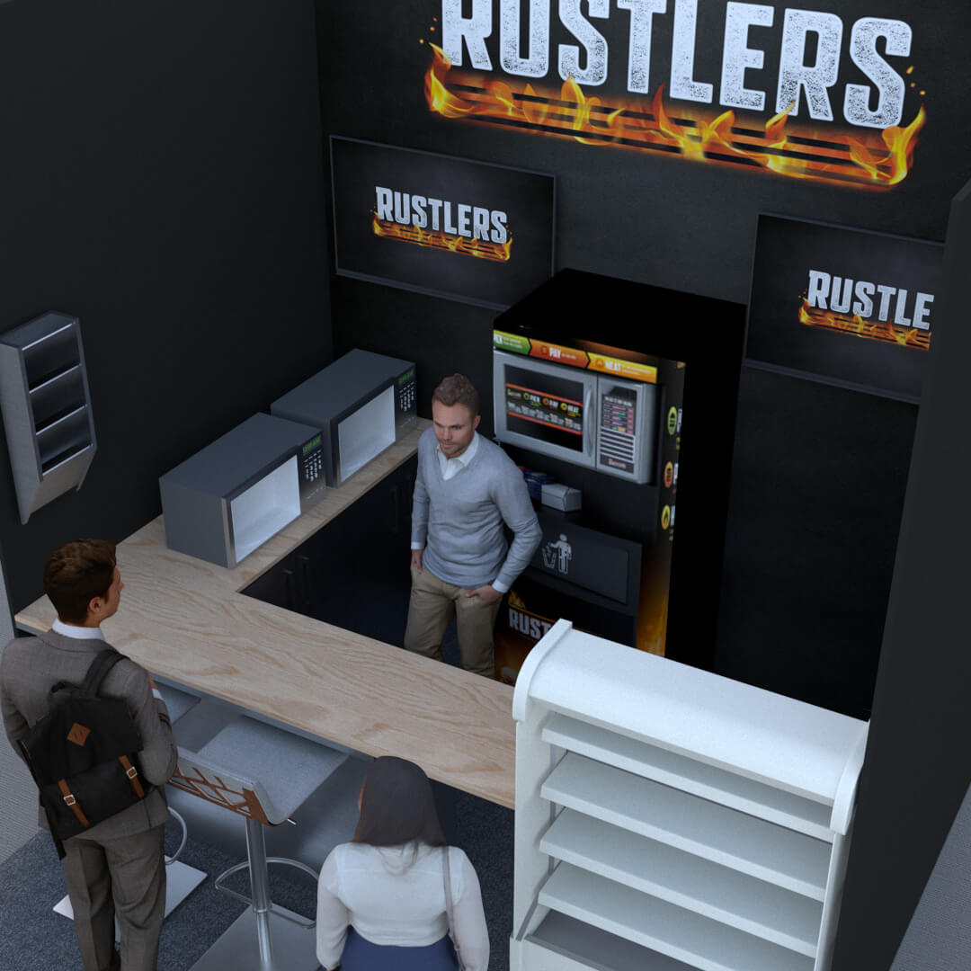 The Rustlers and Burts Crisps stands were compact installations requiring concise layouts with minimal room for error. Despite the smaller scale, the same process applied: build accurate models, test configurations, and render visuals to ensure that both brands could see exactly how their limited space would work in practice. These micro layouts benefited the most from visualisation because even small misjudgments in spacing can impact usability on event day.