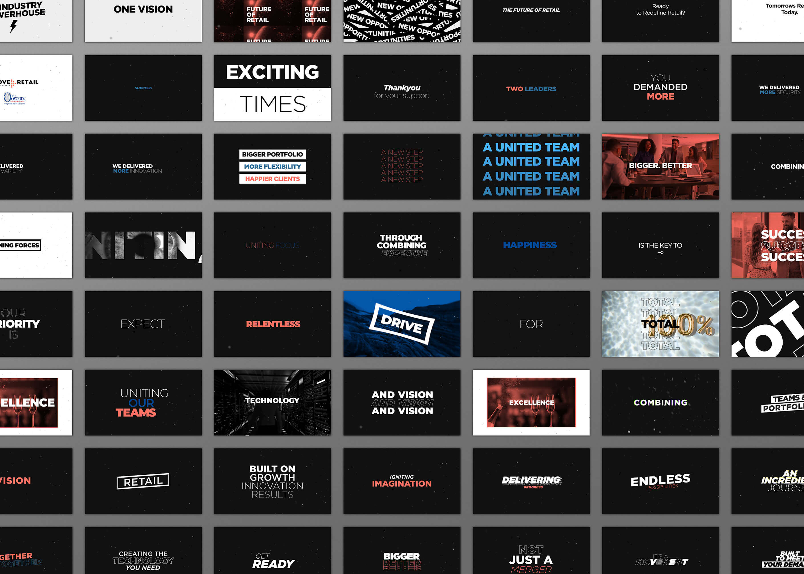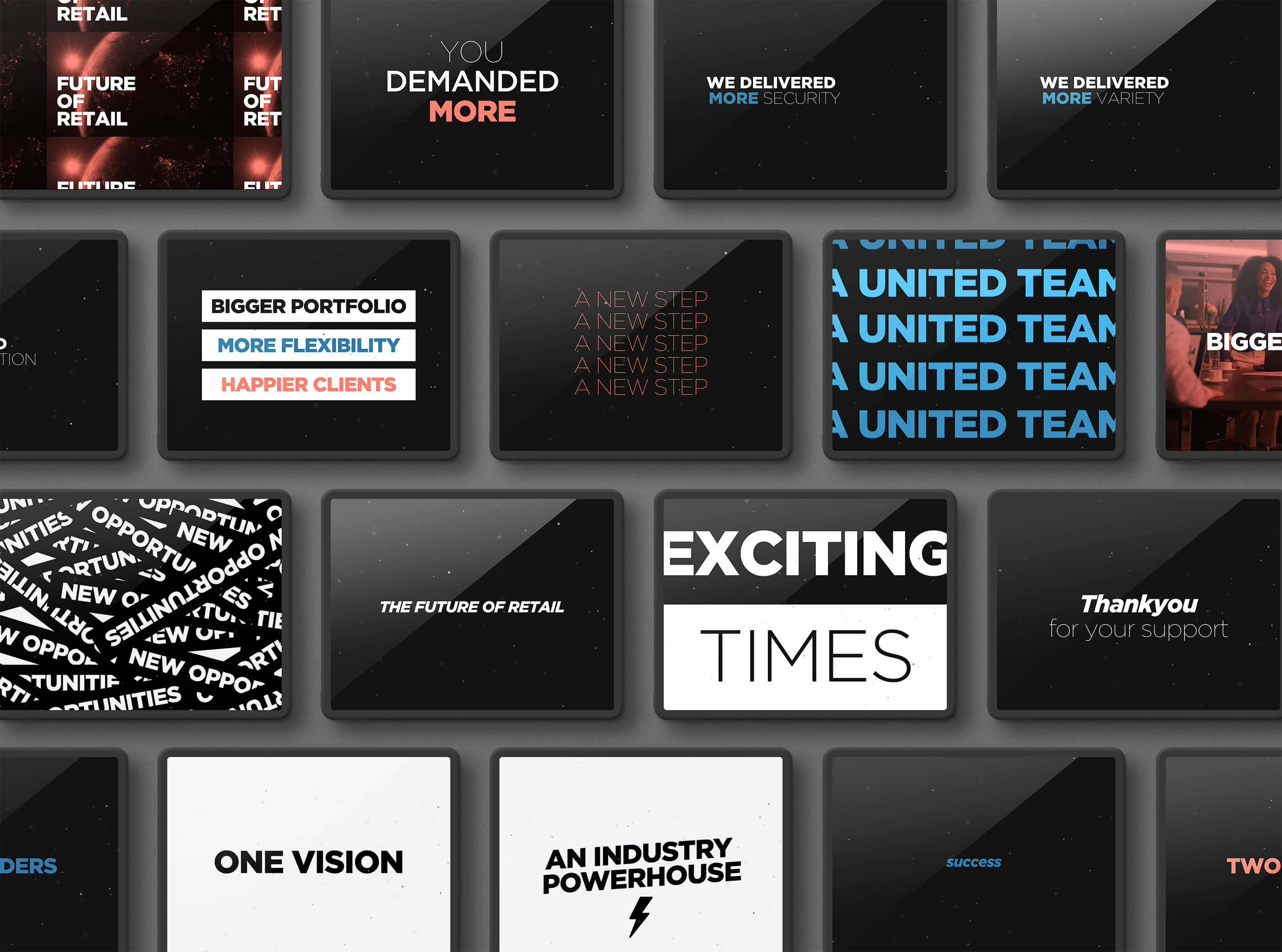 The campaign’s centrepiece was a series of four kinetic typography videos created in After Effects. Each film used short, impactful messaging that appeared for only a second or two before transforming into the next line, creating a rapid-fire sense of momentum and change. This fast-paced rhythm mirrored the pace of modern retail and reflected the energy behind the merger itself.