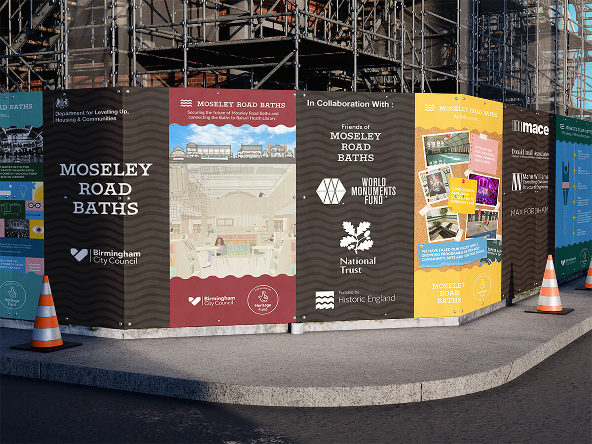 Our role was split into two connected parts. First, we were commissioned to design hoarding boards for the exterior construction site. These boards needed to reflect the existing brand while helping passersby understand the scale and ambition of the Diving In redevelopment. They needed to feel welcoming, confident, and rooted in the Baths’ identity as a community led heritage site.